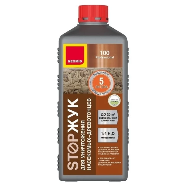 Neomid Stopжук 100 концентрат для защиты древесины от жуков-древоточцев. Идеален для обработки деревянных конструкций и мебели.