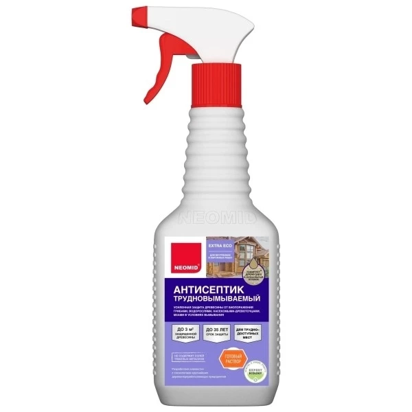 Одним из главных преимуществ Neomid является несмываемость, благодаря специальной формуле, антисептики не вымываются водой, что обеспечивает длительную защиту от биопоражения. Это особенно важно для наружных поверхностей, которые постоянно подвергаются воздействию атмосферных осадков.