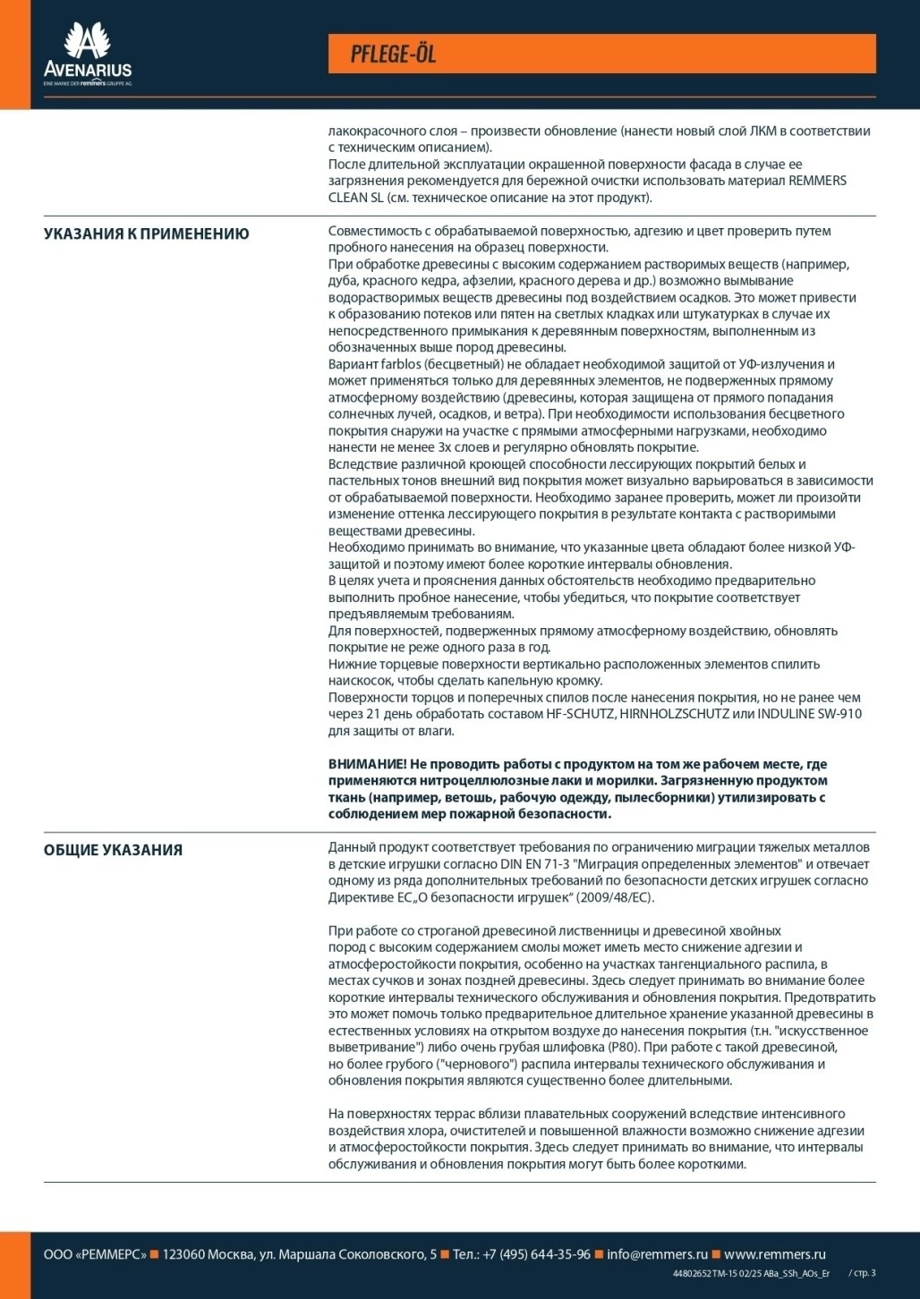Наносить материал кистью для лазурей, широкой плоской кистью или хлопчатобумажной тканью вдоль волокон. По возможности при нанесении первого слоя обработать элементы со всех сторон (например, при обработке террасной доски). Излишек материала аккуратно снять сухой кистью или мягкой тканью не позднее 30 минут (при нормальных условиях) после нанесения. После высыхания (~ 12 часов) выполнить повторное нанесение. На смежных поверхностях рекомендуется применять материал одной партии (материалы из разных партий предварительно смешать друг с другом), поскольку в противном случае могут иметь место незначительные различия в цветовом оттенке Вскрытую емкость плотно закрыть и использовать оставшийся материал как можно скорее.