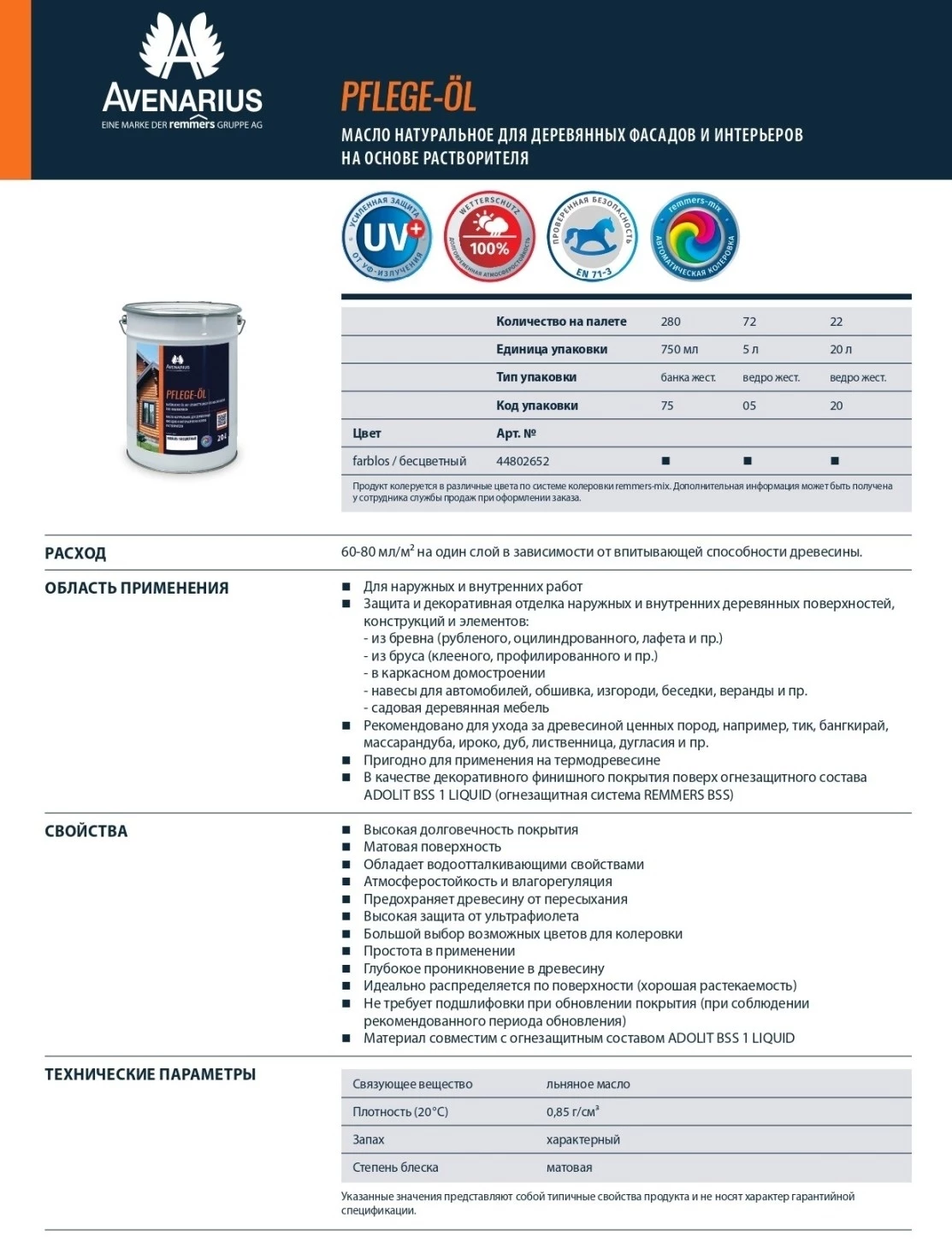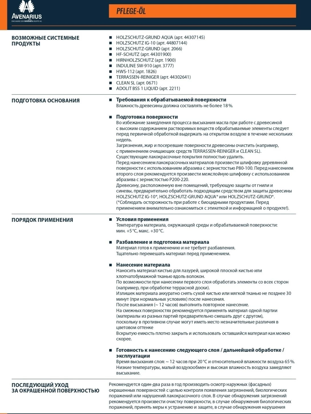 Avenarius Pflege-Oel Масло натуральное для деревянных фасадов и интерьеров на основе растворителя