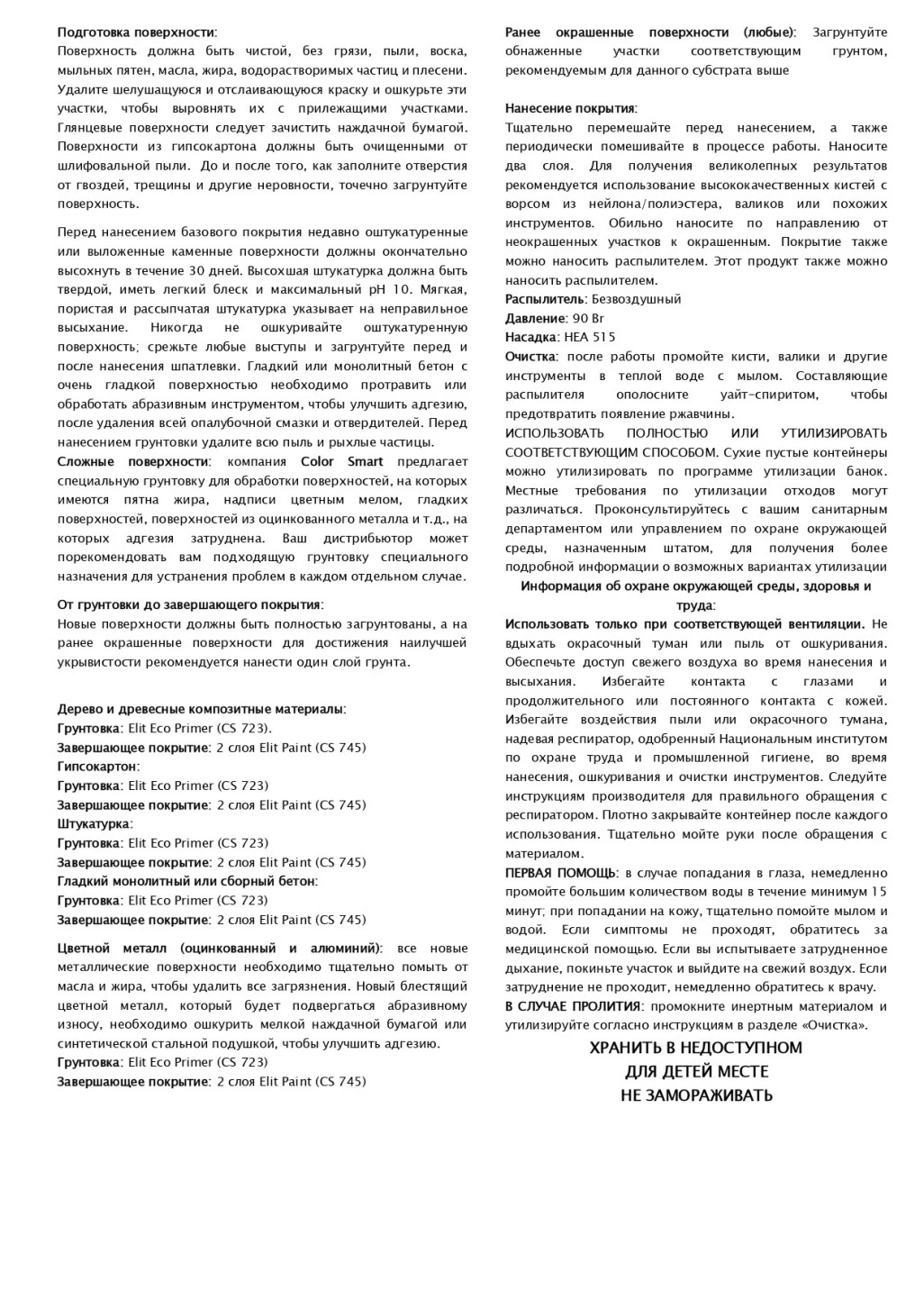 Поверхность должна быть чистой, без грязи, пыли, воска, мыльных пятен, масла, жира, водорастворимых частиц и плесени. Удалите шелушащуюся и отслаивающуюся краску и ошкурьте эти участки, чтобы выровнять их с прилежащими участками. Глянцевые поверхности следует зачистить наждачной бумагой. Поверхности из гипсокартона должны быть очищенными от шлифовальной пыли. До и после того, как заполните отверстия от гвоздей, трещины и другие неровности, точечно загрунтуйте поверхность. Перед нанесением базового покрытия недавно оштукатуренные или выложенные каменные поверхности должны окончательно высохнуть в течение 30 дней. Высохшая штукатурка должна быть твердой, иметь легкий блеск и максимальный pH 10. Мягкая, пористая и рассыпчатая штукатурка указывает на неправильное высыхание. Никогда не ошкуривайте оштукатуренную поверхность; срежьте любые выступы и загрунтуйте перед и после нанесения шпатлевки. Гладкий или монолитный бетон с очень гладкой поверхностью необходимо протравить или обработать абразивным инструментом, чтобы улучшить адгезию, после удаления всей опалубочной смазки и отвердителей. Перед нанесением грунтовки удалите всю пыль и рыхлые частицы. Сложные поверхности: компания Color Smart предлагает специальную грунтовку для обработки поверхностей, на которых имеются пятна жира, надписи цветным мелом, гладких поверхностей, поверхностей из оцинкованного металла и т.д., на которых адгезия затруднена. Ваш дистрибьютор может порекомендовать вам подходящую грунтовку специального назначения для устранения проблем в каждом отдельном случае. От грунтовки до завершающего покрытия: Новые поверхности должны быть полностью загрунтованы, а на ранее окрашенные поверхности для достижения наилучшей укрывистости рекомендуется нанести один слой грунта.