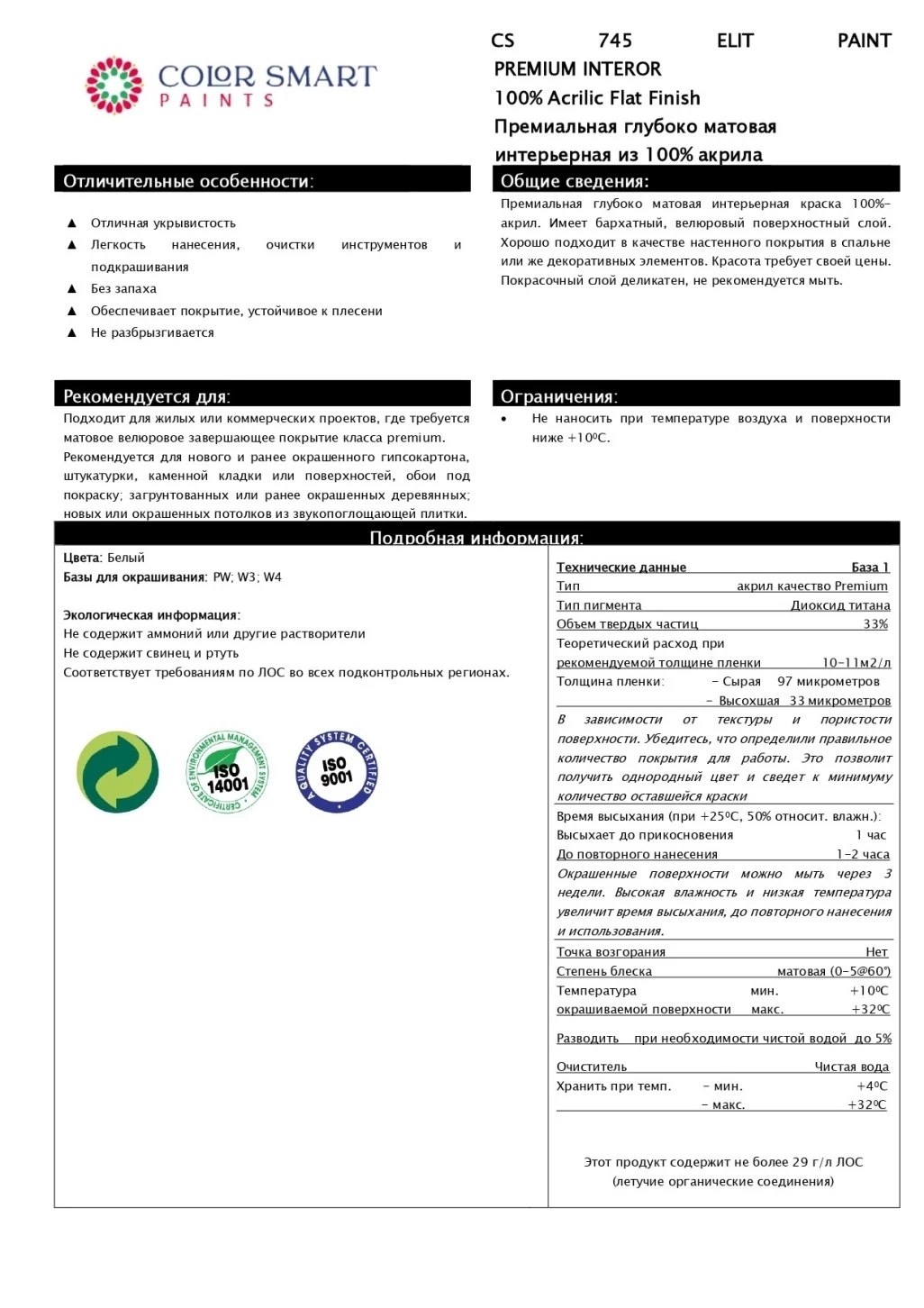 Color Smart 745 Elit Paint Краска интерьерная премиальная глубокоматовая из 100% акрила