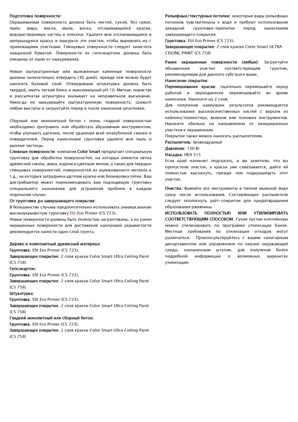 Подготовка поверхности:Окрашиваемая поверхность должна быть чистой, сухой, без грязи, пыли, жира, масла, мыла, воска, отслаивающейся краски, водорастворимых частиц и плесени. Удалите всю отслаивающуюся и шелушащуюся краску и ошкурьте эти участки, чтобы выровнять их с прилежащими участками. Глянцевые поверхности следует зачистить наждачной бумагой. Поверхности из гипсокартона должны быть очищены от пыли от ошкуривания.Новые оштукатуренные или выложенные каменные поверхности должны окончательно отвердеть (30 дней), прежде чем можно будет наносить базовый слой. Отвердевшая штукатурка должна быть твердой, иметь легкий блеск и максимальный pH 10. Мягкая, пористая и рассыпчатая штукатурка указывает на неправильное высыхание. Никогда не ошкуривайте оштукатуренную поверхность; срежьте любые выступы и загрунтуйте перед и после нанесения шпатлевки. Сборный или монолитный бетон с очень гладкой поверхностью необходимо протравить или обработать абразивным инструментом, чтобы улучшить адгезию, после удаления всей опалубочной смазки и отвердителей. Перед нанесением грунтовки удалите всю пыль и рыхлые частицы. Сложные поверхности: компания Color Smart предлагает специальную грунтовку для обработки поверхностей, на которых имеются пятна древесной смолы, жира, надписи цветным мелом, а также для твердых глянцевых поверхностей, поверхностей из оцинкованного металла и т.д., на которых затруднена адгезия краски или блокировка пятен. Ваш дистрибьютор может порекомендовать вам подходящую грунтовку специального назначения для устранения проблем в каждом отдельном случае. От грунтовки до завершающего покрытия: В большинстве случаев предпочтительно использовать универсальную высокоукрывистую грунтовку Elit Eco Primer (CS 723). Новые поверхности должны быть полностью загрунтованы, а на ранее окрашенные поверхности для достижения наилучшей укрывистости рекомендуется нанести один слой грунта. |