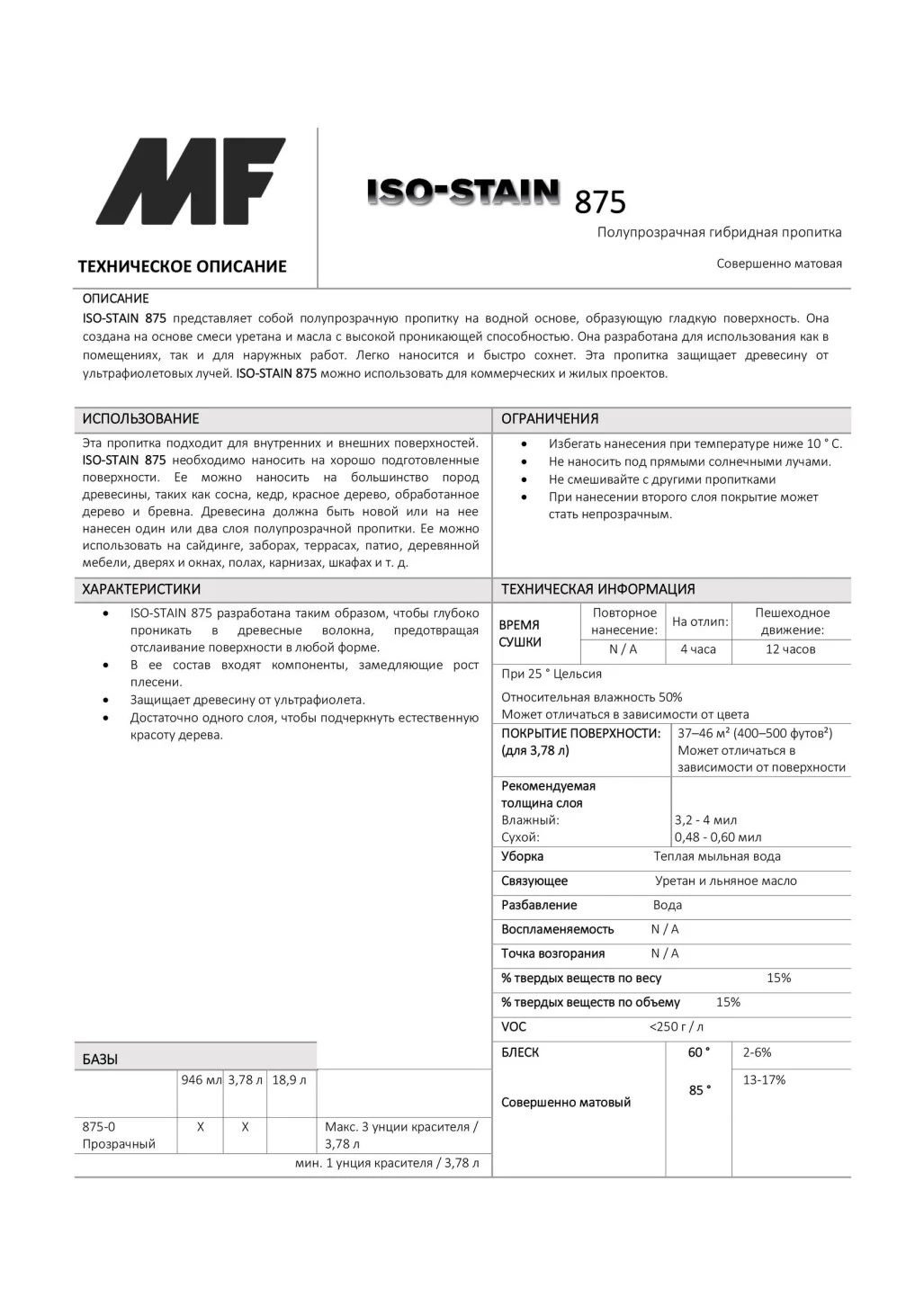 MF Paints ISO-STAIN 875 Пропитка на основе смеси уретана и сверхпроникающего масла для внутреннего и наружного применения