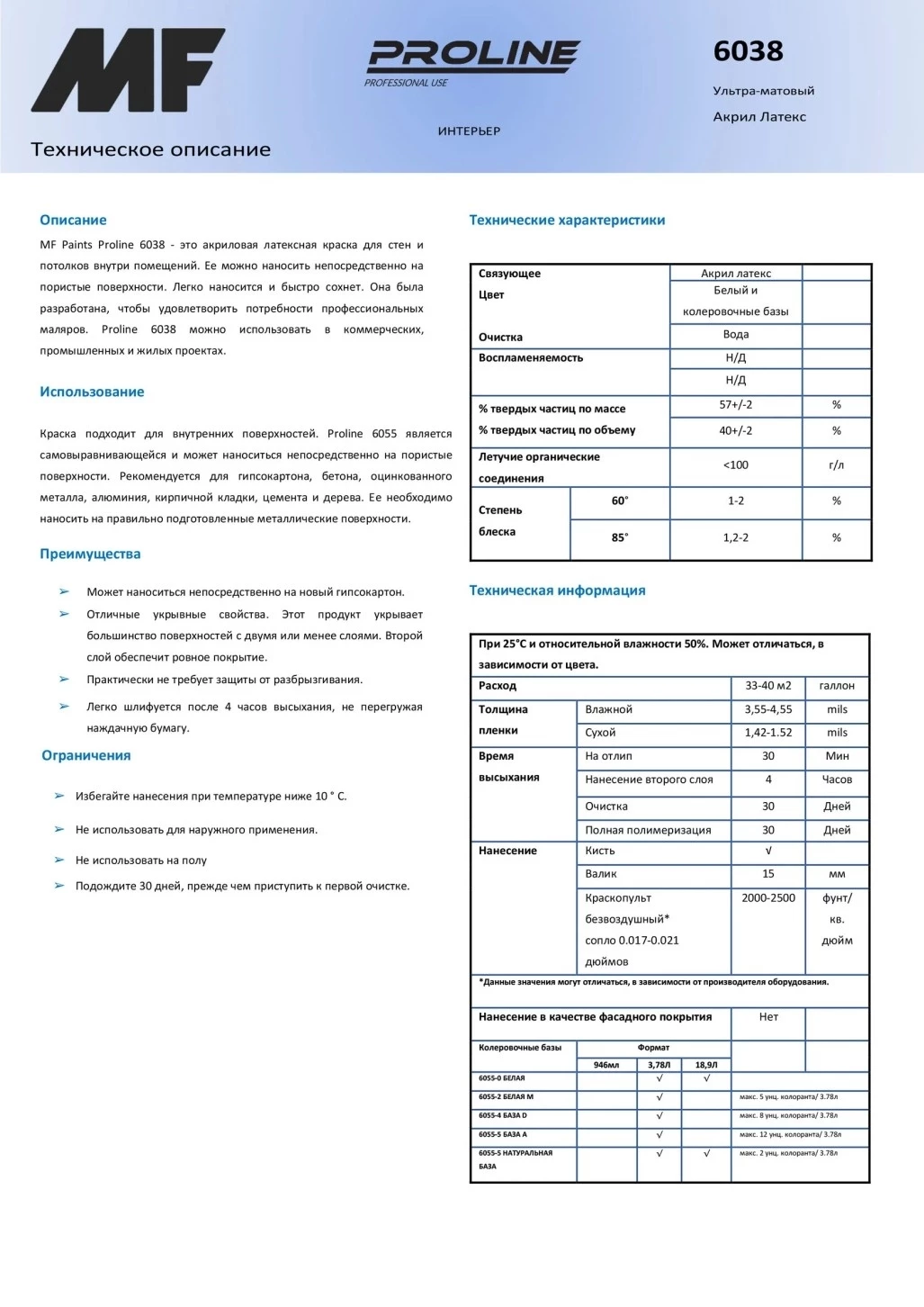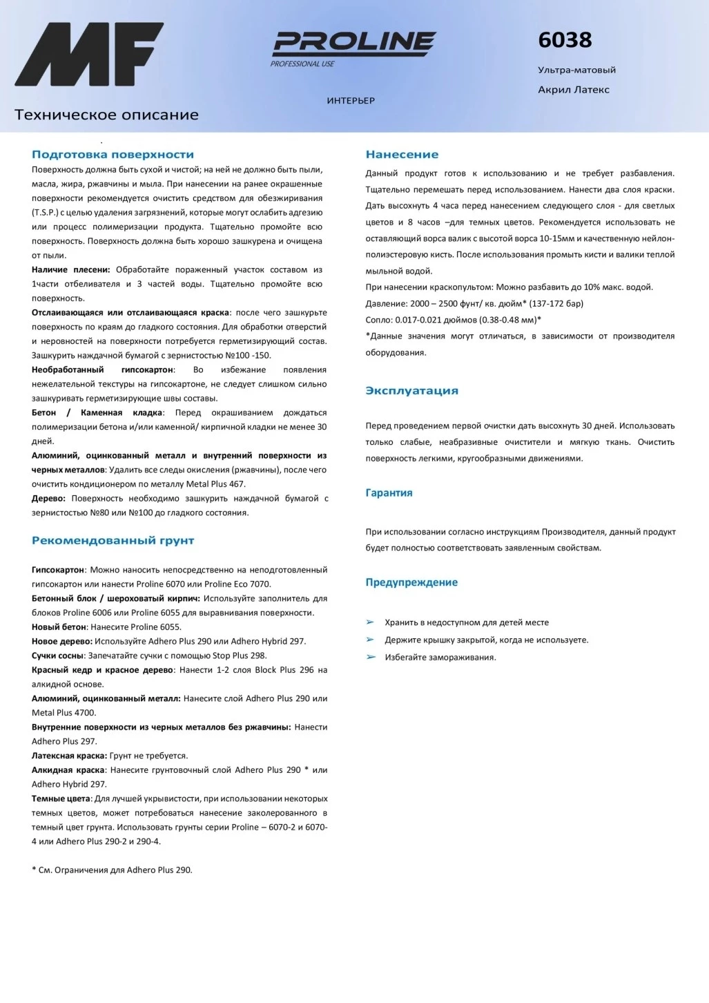 MF Paints Proline Blue 6038 Ultra Flat Краска акриловая латексная самовыравнивающаяся для внутренних работ