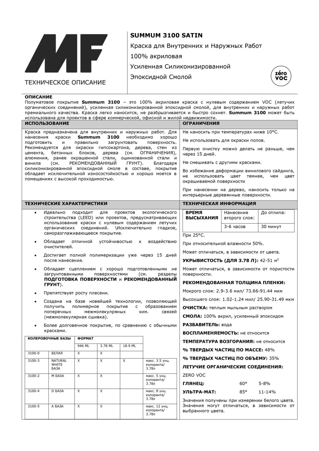 MF Paints Summum 3100 Краска для внутренних и наружных работ усиленная силиконизированной эпоксидной смолой
