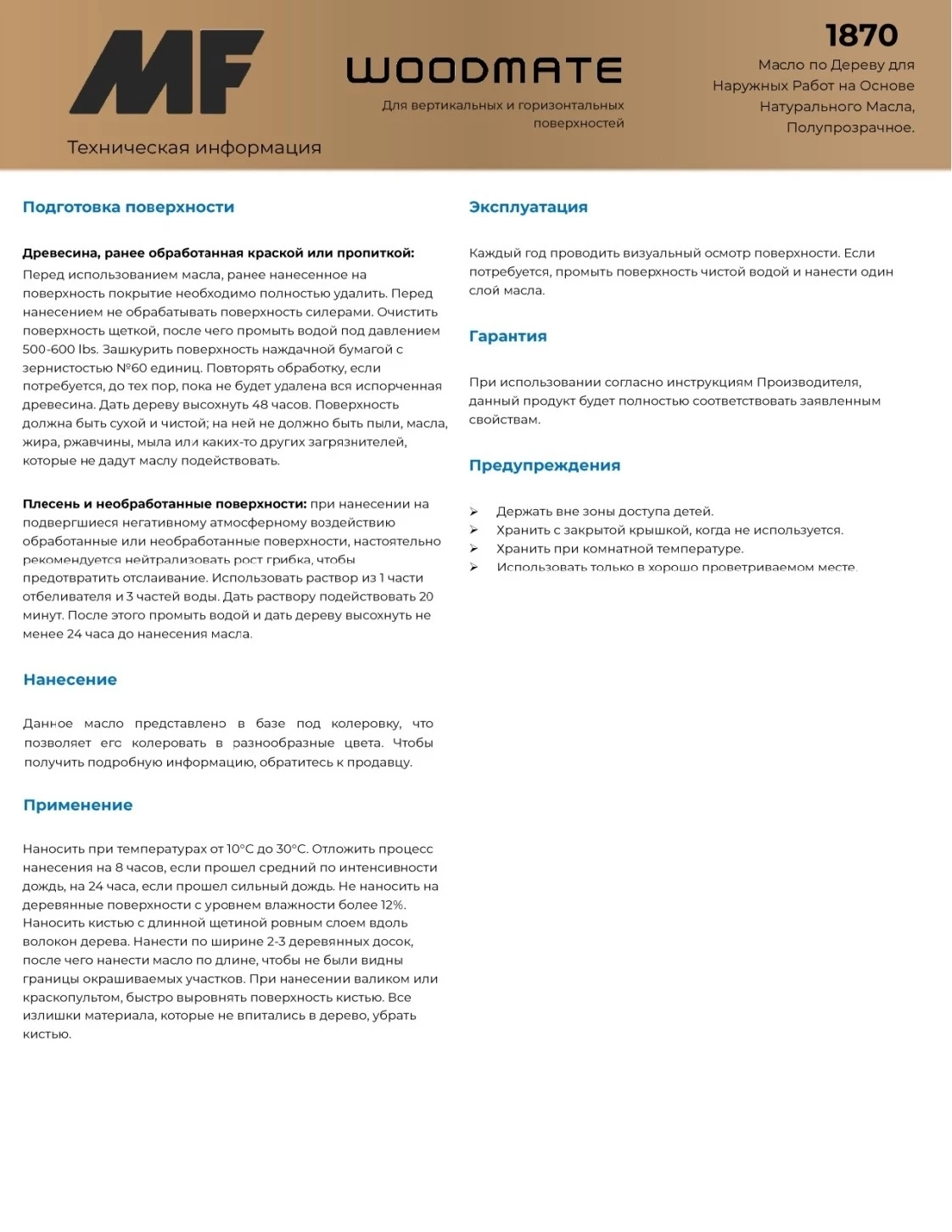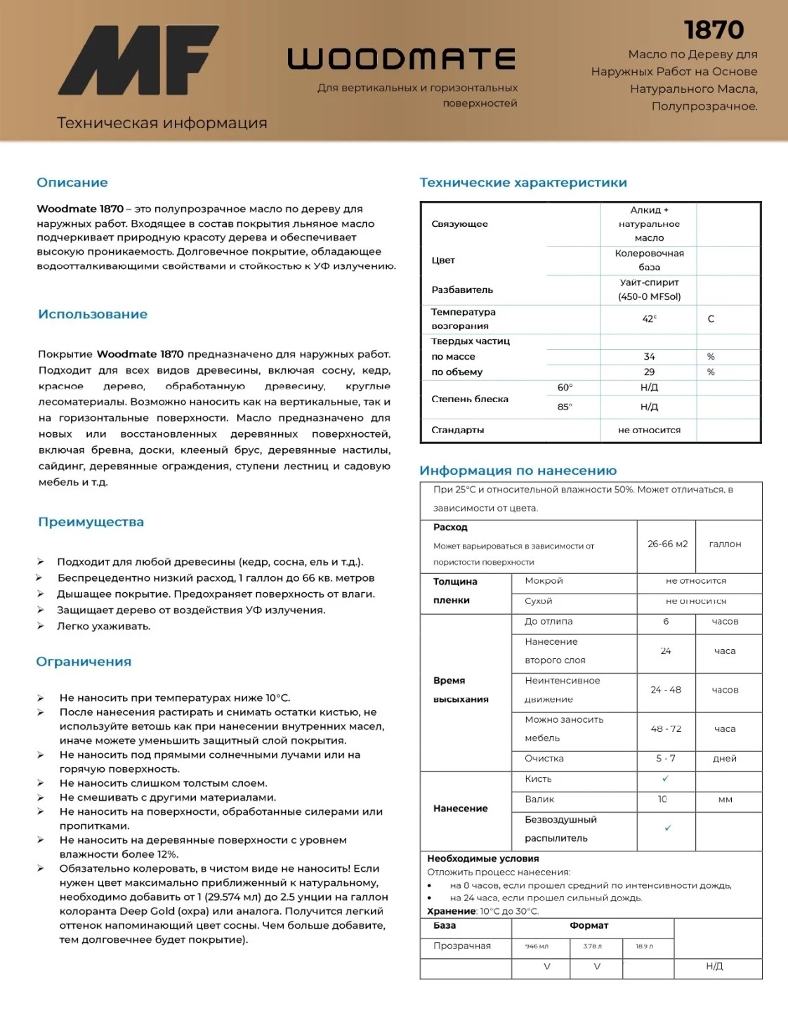 MF Woodmate 1870 Алкидная Пропитка по Дереву для наружных работ полупрозрачная