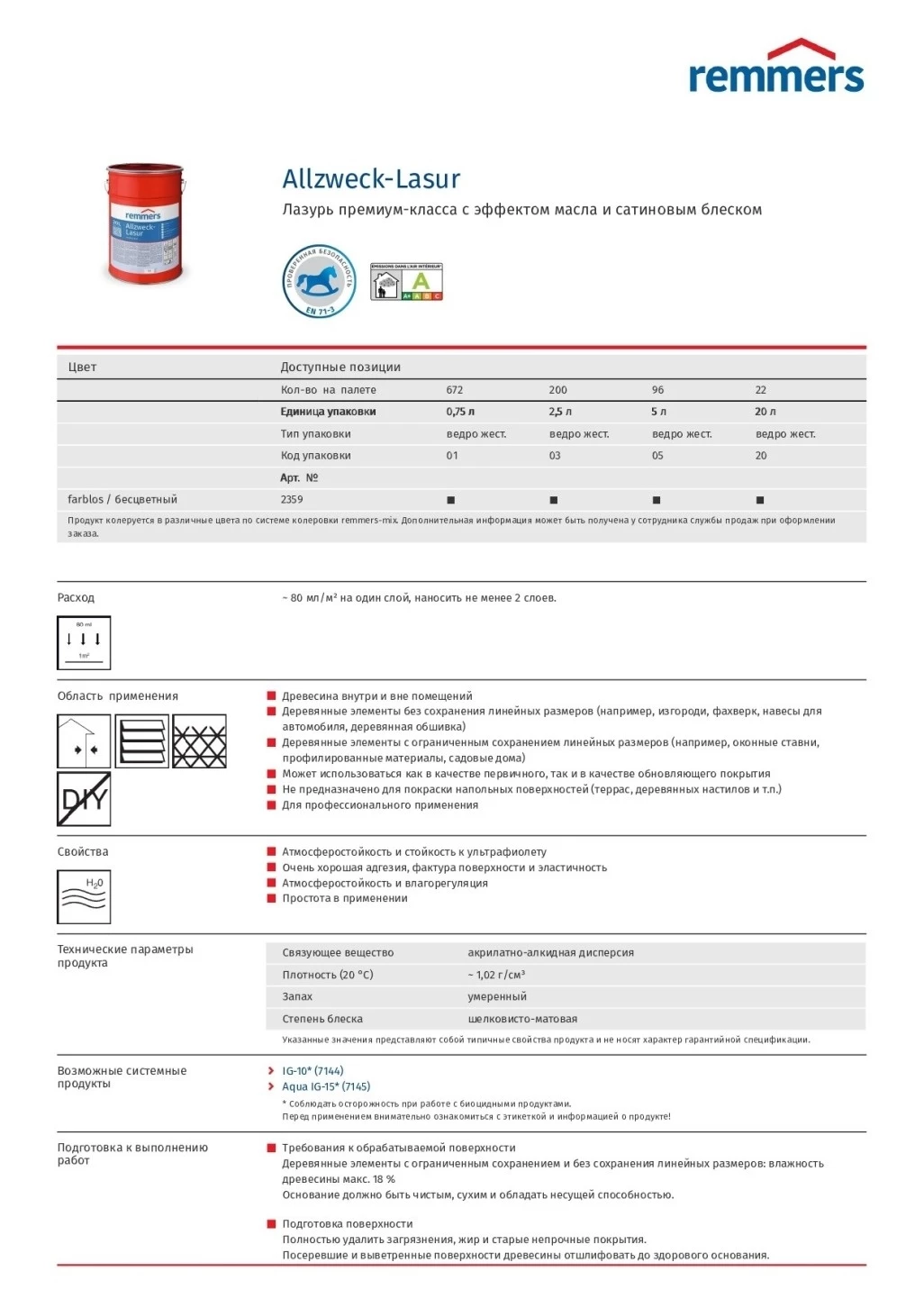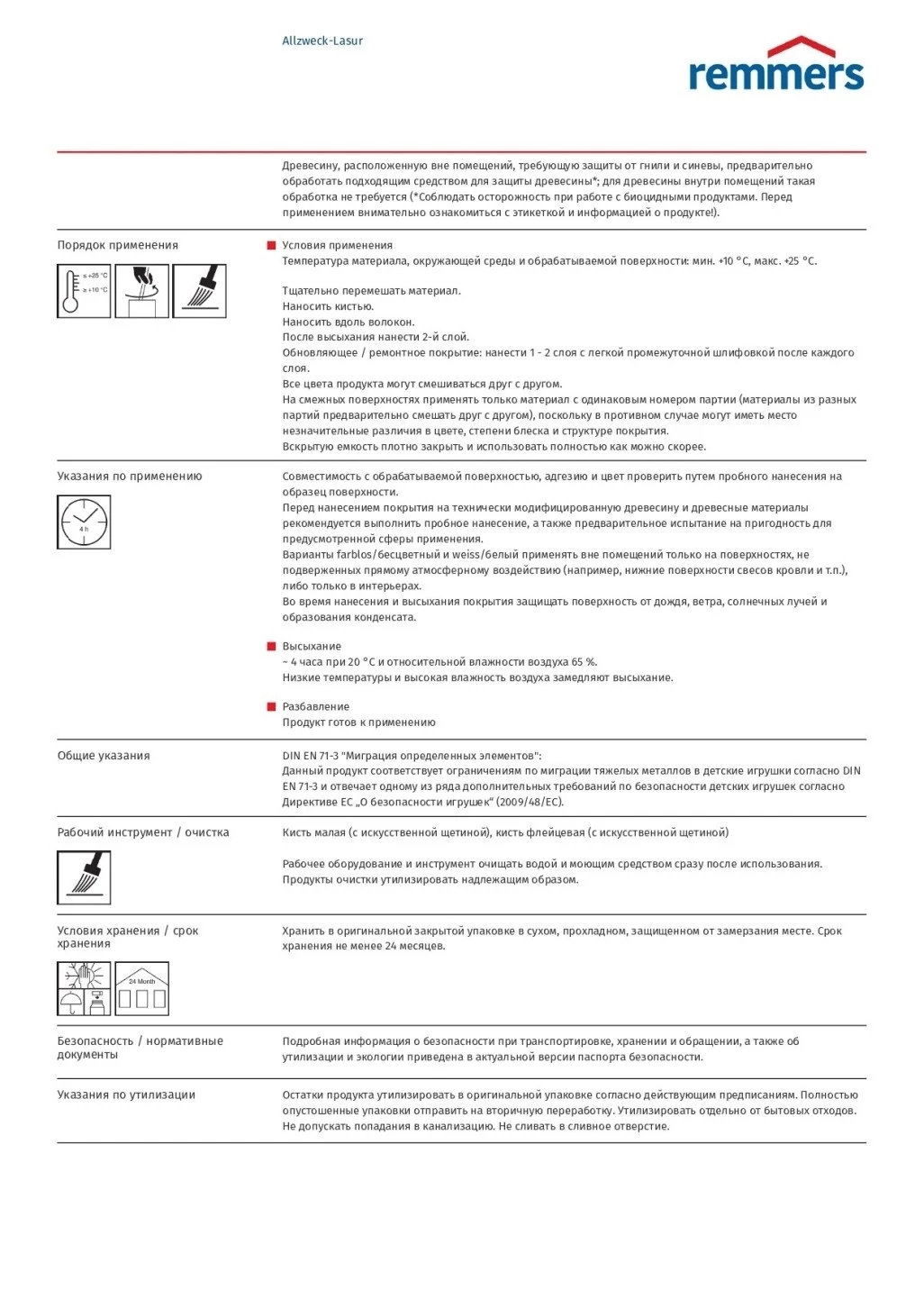 - Продукт Allzweck-Lasur в оттенках farblos/бесцветный, hemlock/ хемлок и weiss/ белый применять только для поверхностей в интерьерах; при применении вне помещений применять только на поверхностях, не подверженных прямым атмосферным нагрузкам (напр., нижние поверхности свесов кровли и др.).