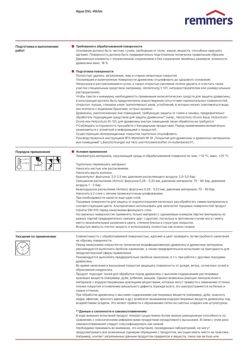 Основание должно быть чистым, сухим, свободным от пыли, жиров, веществ, способных нарушать адгезию. Поверхность должна быть предварительно подготовлена технически правильным образом. Деревянные элементы с ограниченным сохранением и без сохранения линейных размеров: влажность древесины макс. 18 %