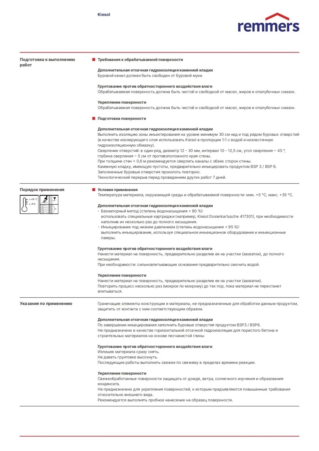 Дополнительная отсечная гидроизоляция каменной кладки Выполнить изоляцию зоны инъектирования на уровне минимум 30 см над и под рядом буровых отверстий (в качестве изолирующего слоя использовать Kiesol в пропорции 1:1 с водой и неэластичную гидроизоляционную обмазку). Сверление отверстий: в один ряд, диаметр 12 - 30 мм, интервал 10 - 12,5 см, угол сверления ~ 45 °, глубина сверления ~ 5 см от противоположного края стены. При толщине стен > 0,6 м рекомендуется сверлить каналы с обеих сторон стены. Каменную кладку, имеющую пустоты, предварительно инъецировать продуктом BSP 3 / BSP 6. Заполненные буровые отверстия проколоть повторно. Технологический перерыв перед проведением других работ 7 дней.