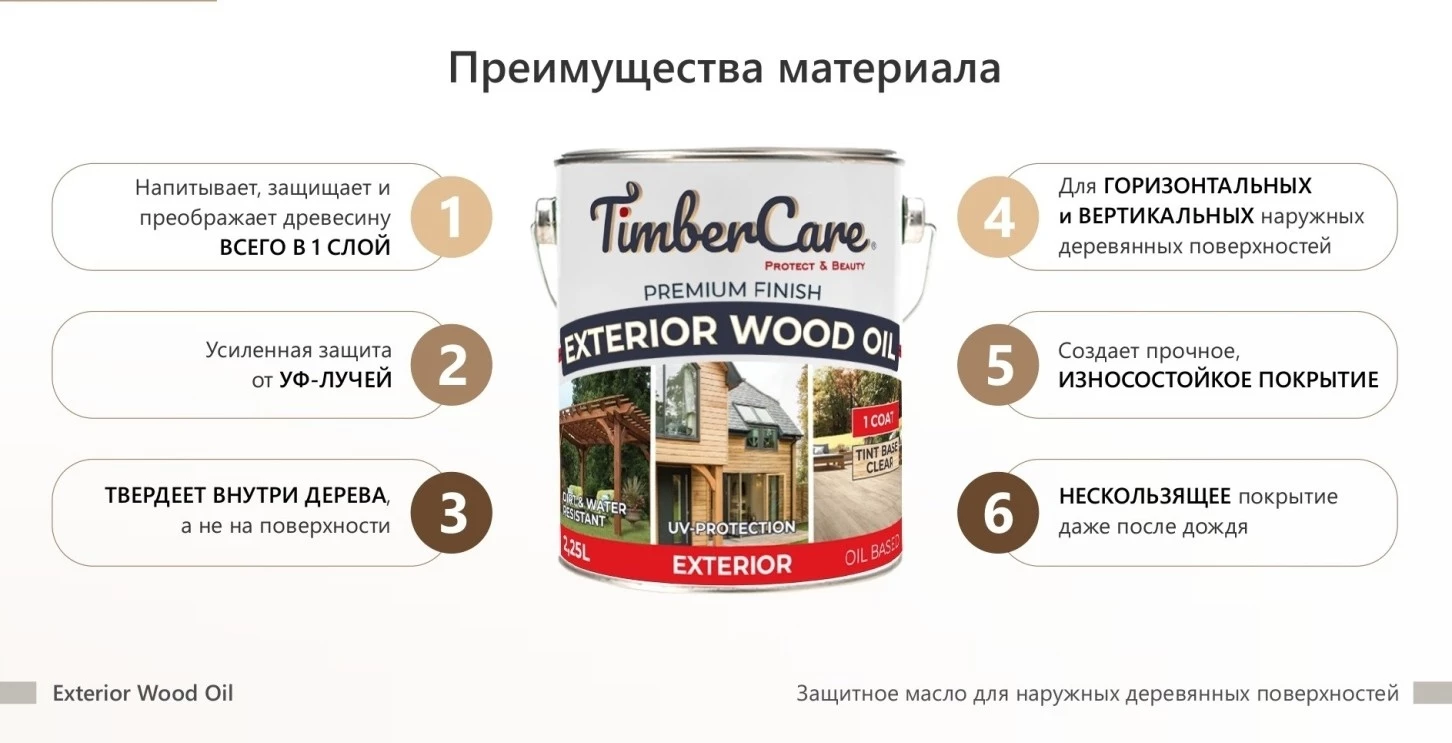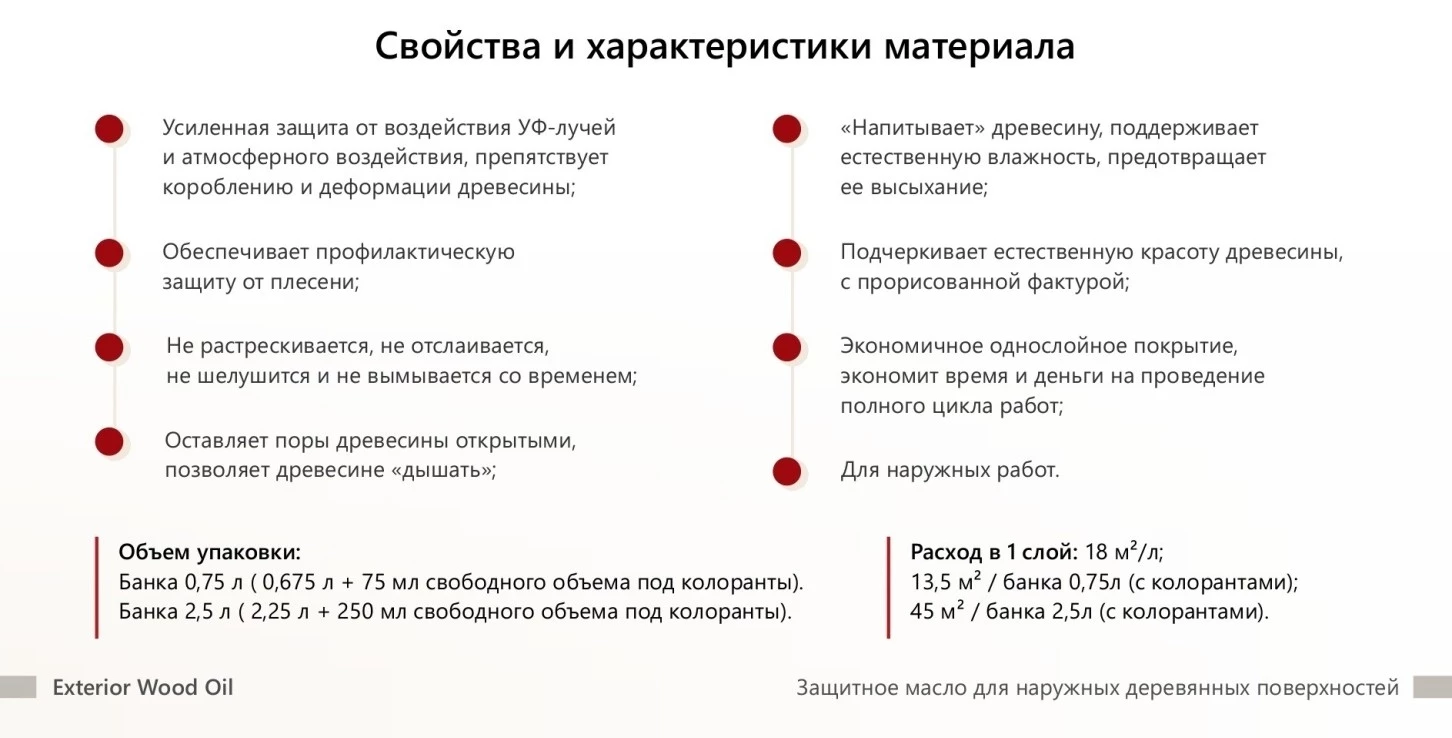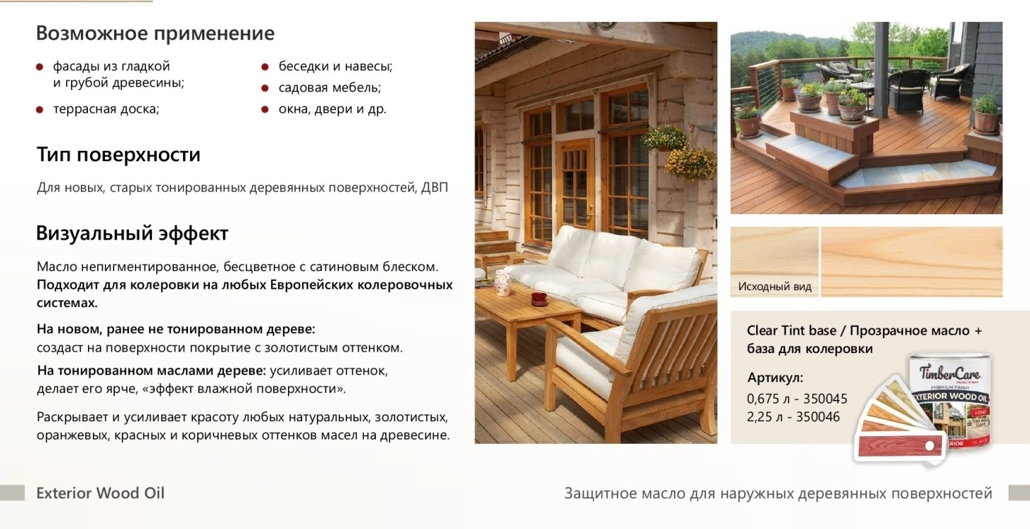 Отлично подходит в качестве состава для первой обработки не тонированного дерева, а также в качестве средства для обновления защитных свойств и восстановления цвета на ранее тонированных маслами поверхностей.