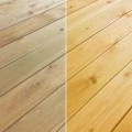 На не тонированном, посеревшем дереве: прозрачный пигмент лимонного оттенка прекрасно маскирует посерение дерева (за 1-2 сезона, время усадки дома из бруса), восстанавливает его первозданный вид естественного тона в 1 слой, не требуя предварительного шлифования!