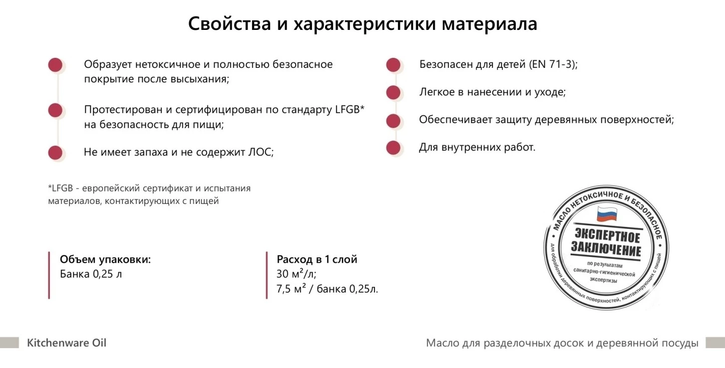 Натуральное масло, специально разработано для покрытия деревянных разделочных столов, разделочных досок, салатниц, подносов для пиццы и других предметов кухонной утвари, контактирующих с пищей.