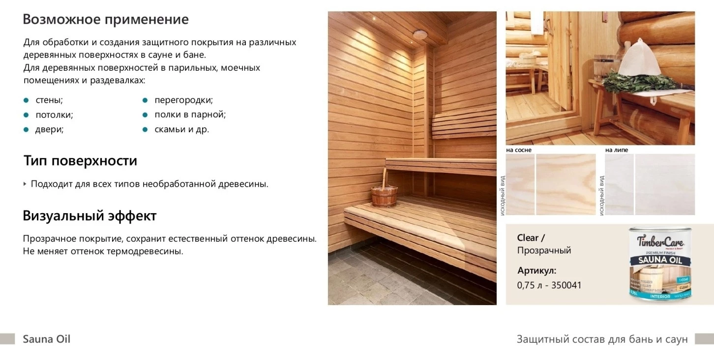 Предназначено для обработки и создания защитного покрытия на различных деревянных поверхностях в сауне и бани. Для деревянных поверхностей в парильных, моечных помещениях и раздевалках: стены, потолки, двери, перегородки, полок в парной, скамьи.